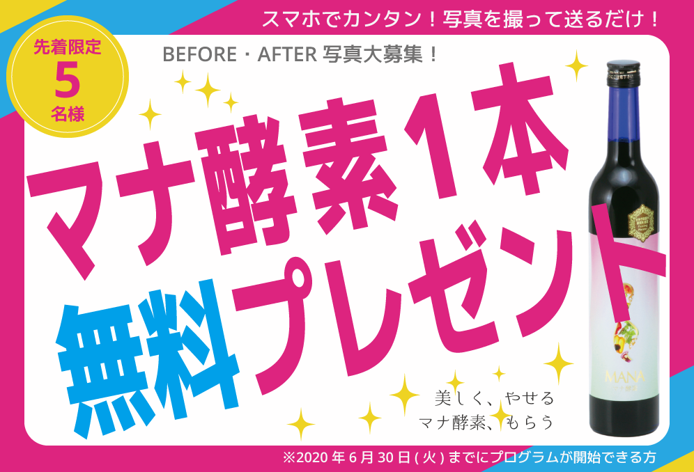 ファスティングの成果がわかるビフォー・アフター写真を送っていただいた方に、なんと、マナ酵素を1本無料プレゼントいたします。6月一杯期間限定のお得なキャンペーンです!
